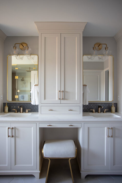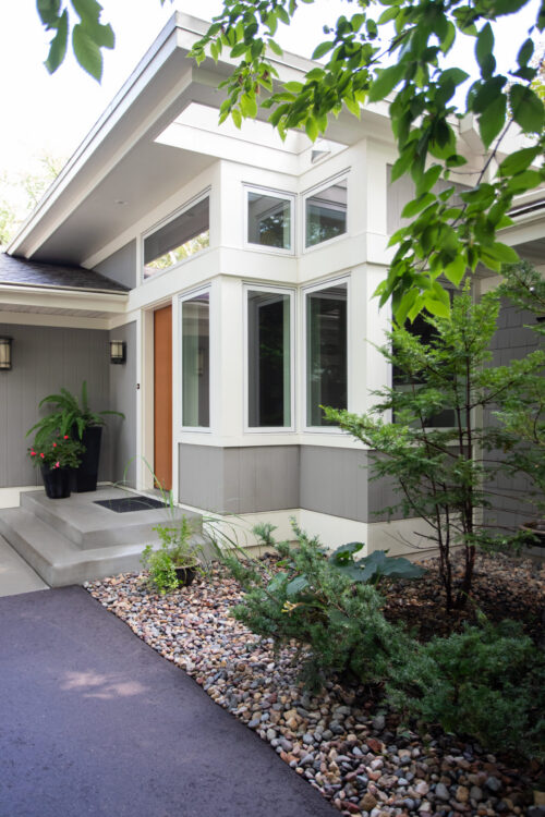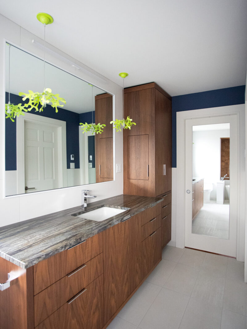 This main-floor and primary bathroom remodel introduces modern details, from twister teak tile to playful light fixtures. A refreshed stairway, unique floor tile, and refinished hardwood bring the front entryway to life. In the mudroom and laundry, custom-stained walnut cabinetry creates a streamlined, functional space that improves flow while adding thoughtful storage.