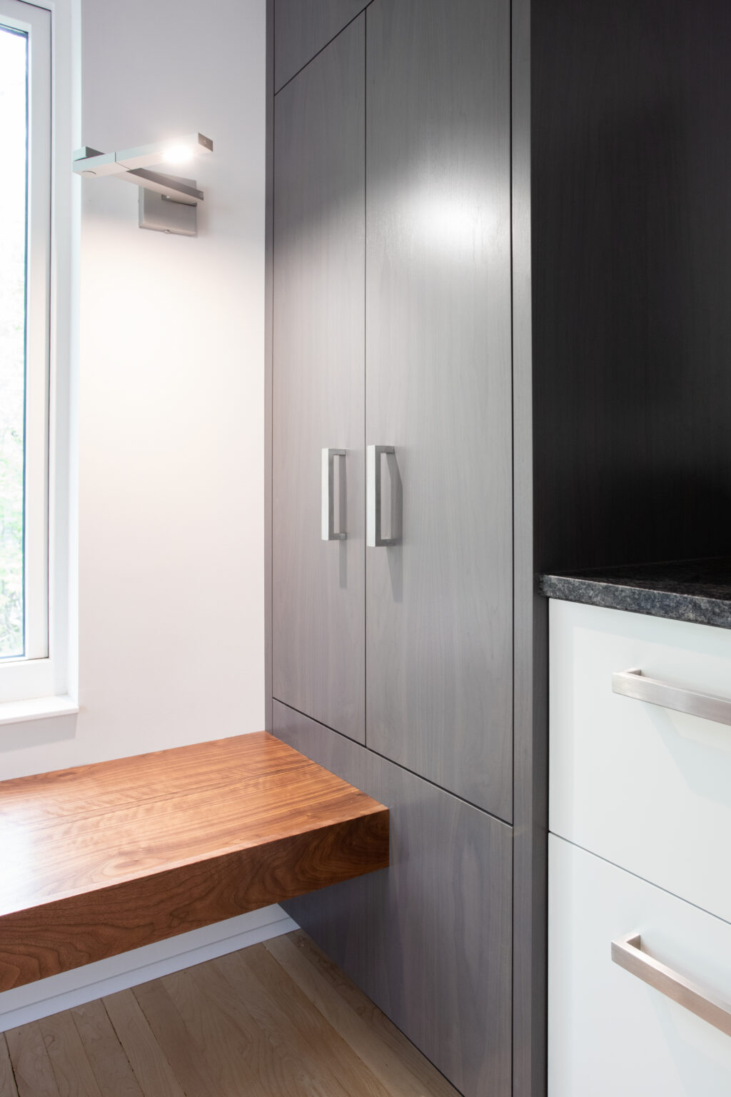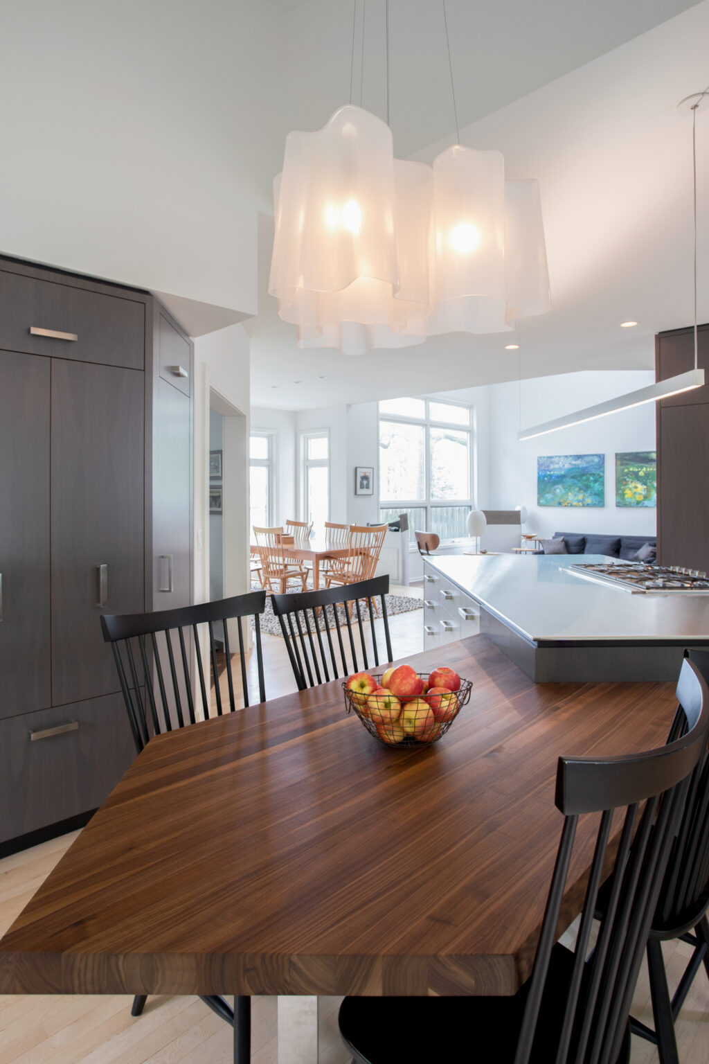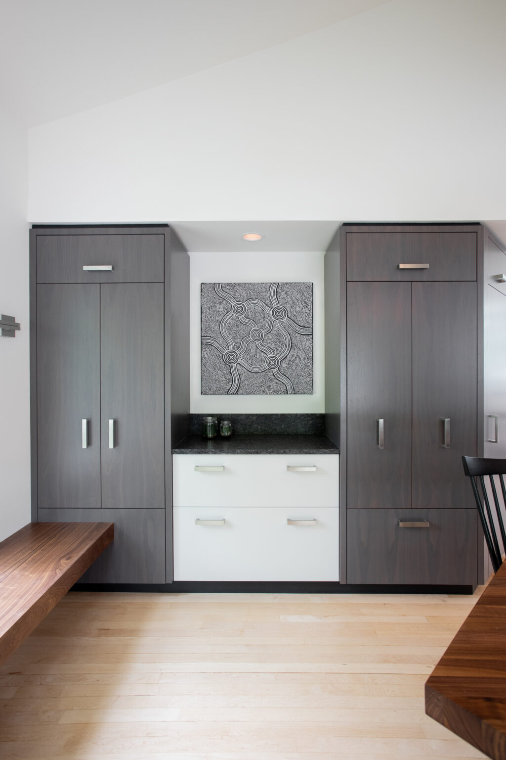 This modern kitchen is anything but boring, with a stunning angled stainless steel countertop kitchen island and attached walnut tabletop focal point. Custom grey and white cabinets create a clean backdrop for more unique design elements to shine, such as a nickel glazed porcelain tile fireplace surround and a textured leather granite backsplash.