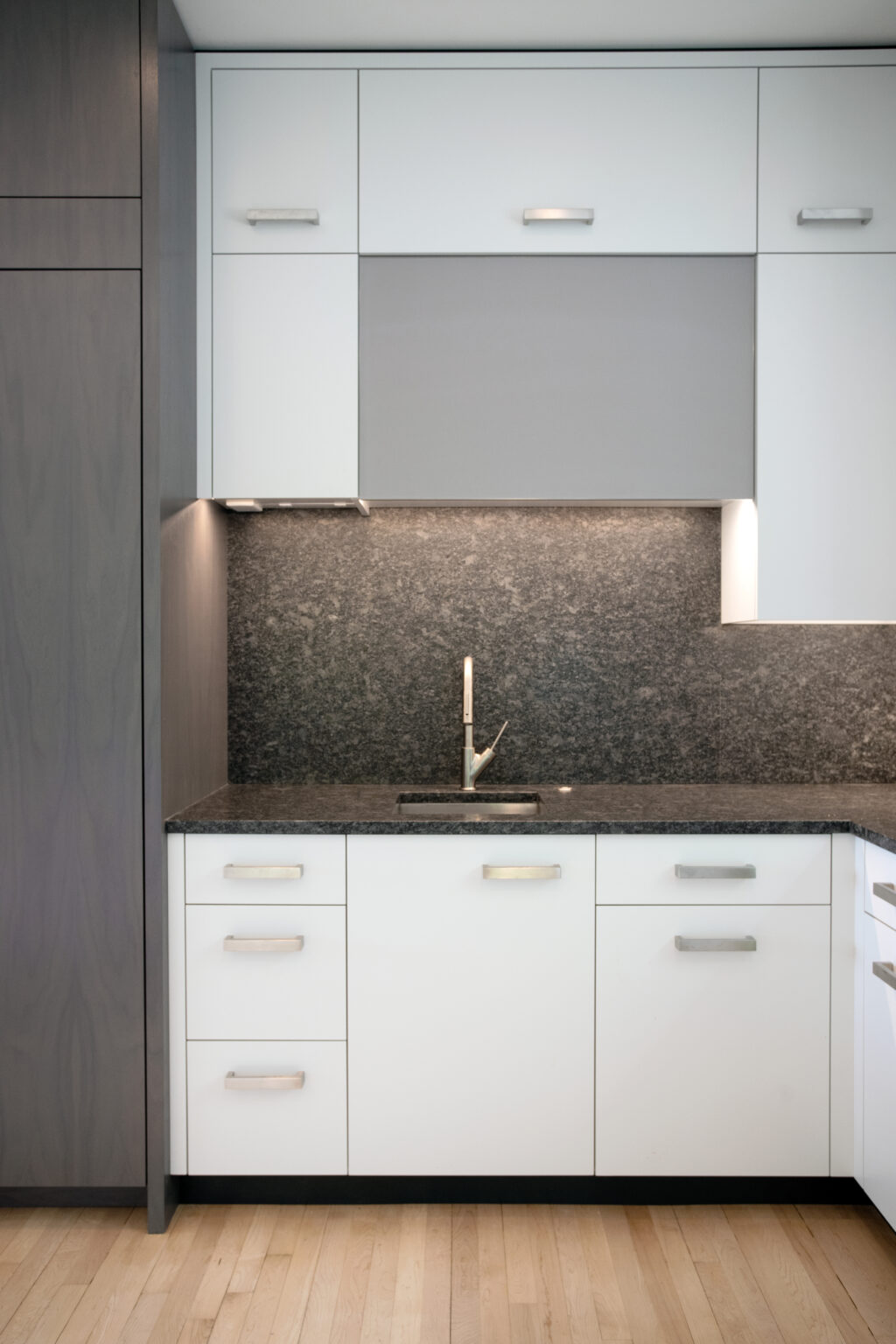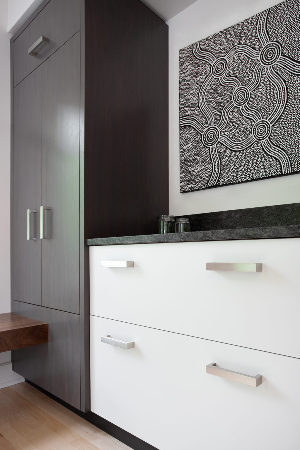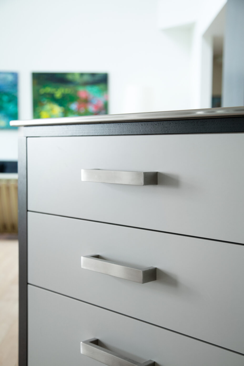 This modern kitchen is anything but boring, with a stunning angled stainless steel countertop kitchen island and attached walnut tabletop focal point. Custom grey and white cabinets create a clean backdrop for more unique design elements to shine, such as a nickel glazed porcelain tile fireplace surround and a textured leather granite backsplash.