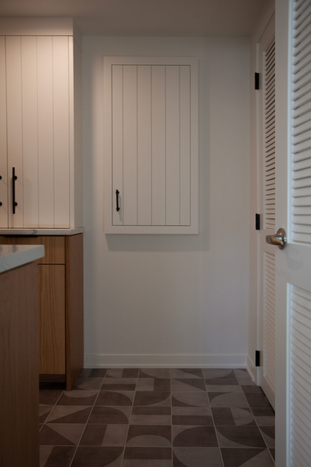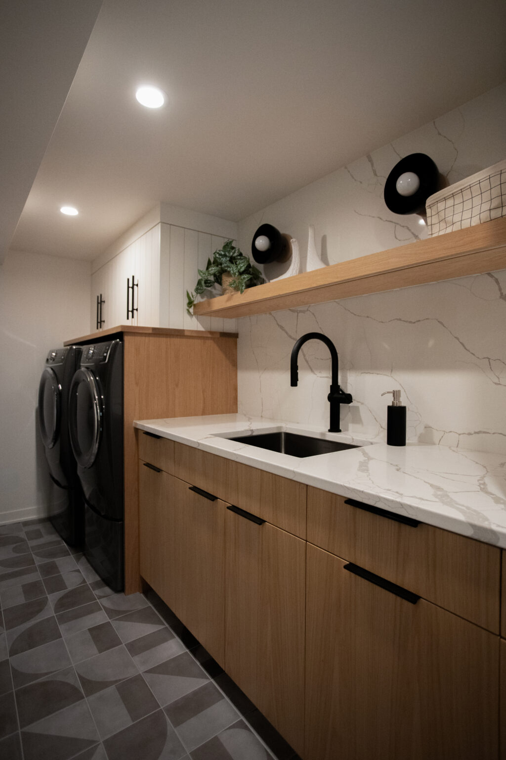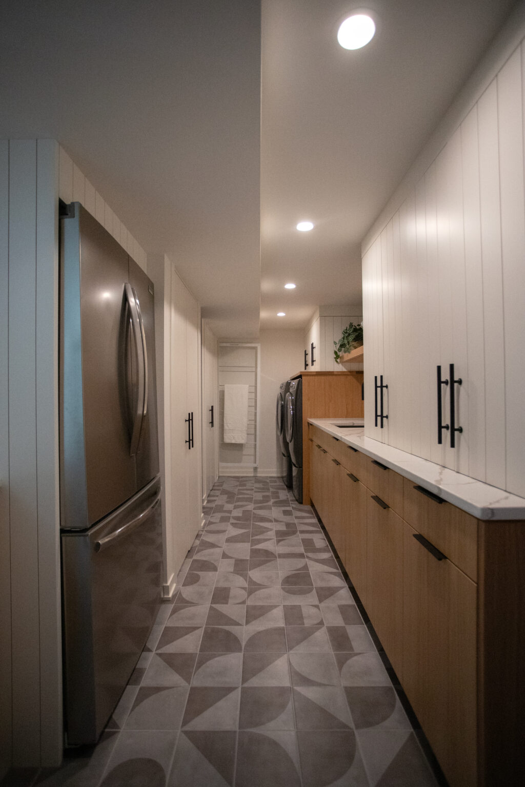 This Wirth Lake remodel transforms the laundry room and lower level family room with modern updates including a new ceiling, recessed lighting, and a relocated HVAC system. Dark gray matte porcelain tile and a modern take on beadboard cabinets give the laundry room a mid-century modern feel, adding both functionality and style.
