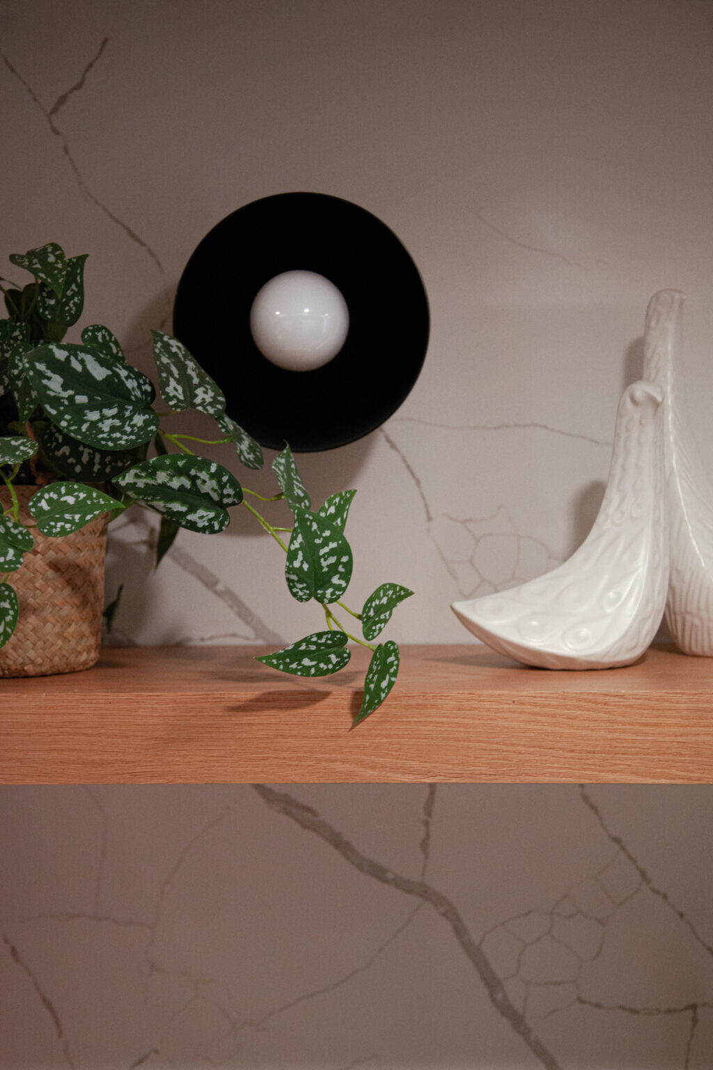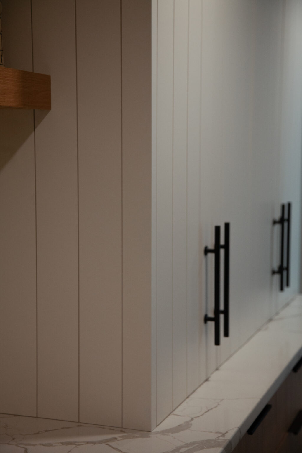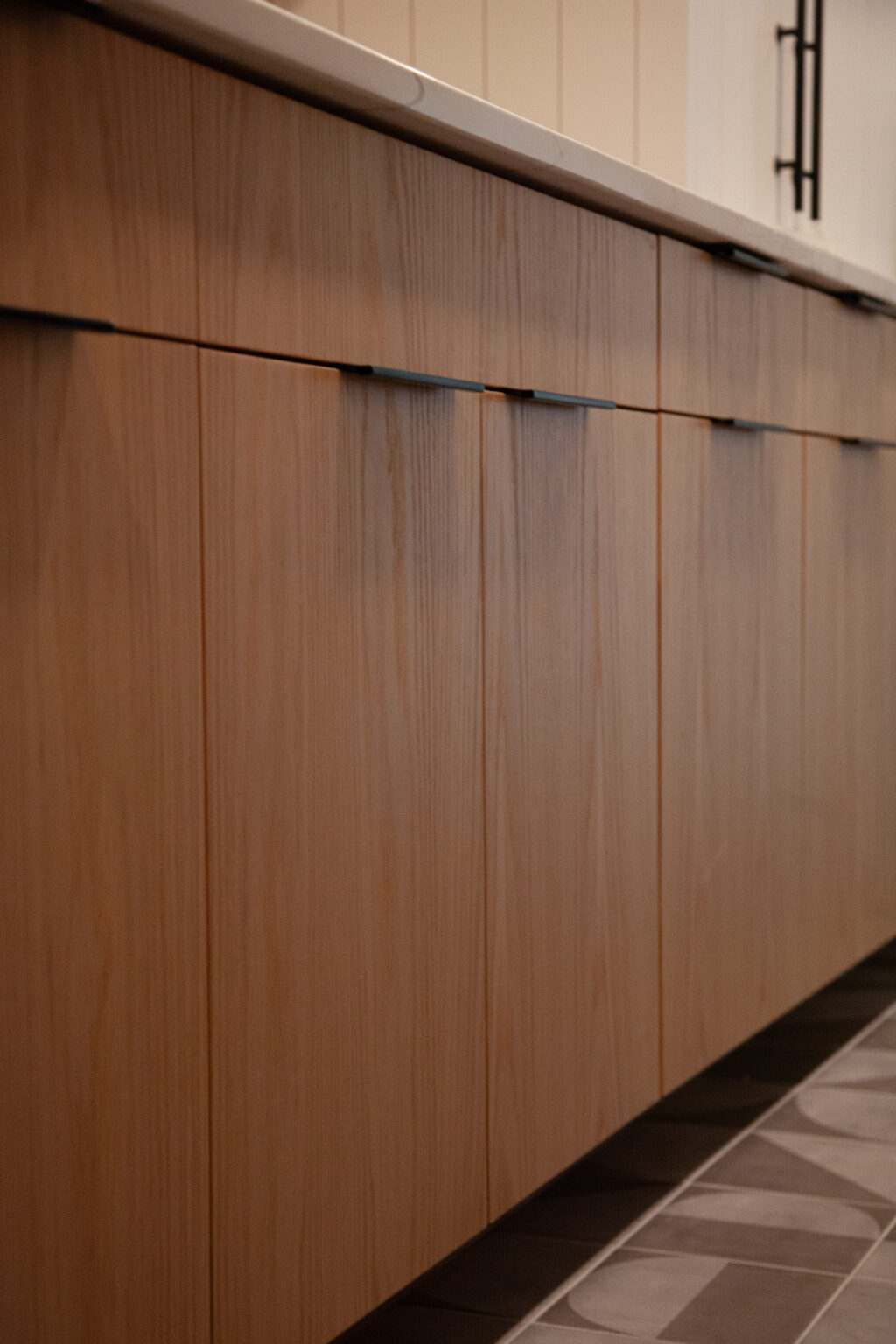 This Wirth Lake remodel transforms the laundry room and lower level family room with modern updates including a new ceiling, recessed lighting, and a relocated HVAC system. Dark gray matte porcelain tile and a modern take on beadboard cabinets give the laundry room a mid-century modern feel, adding both functionality and style.